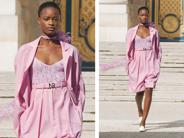 ¡Una propuesta de Nina Ricci con la que dejar a todos los invitados anonadados! Se trata de un traje rosa monocolor formado por una bermuda de tiro alto adornada con un cinturón que combina con una blazer abierta de cuello y solapa de manga larga. Una camisa de tirantes rosa con detalles de encaje. El toque que acaba de darle el puntazo a este look de boda es el collar de cuero rosa con plumas. ¿Qué te parece?